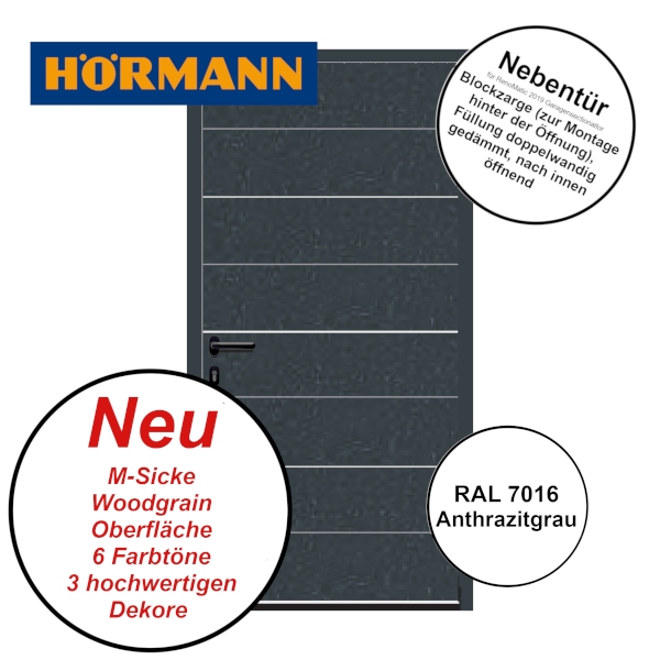 Nebentür M-Sicke Woodgrain von Hörmann für Renomatic in CH 703 mit Blockzarge doppelwandig gedämmte Garagennebentür in verschiendenen Größen, CH 703 Anthrazit metallic, M-Sicke, Woodgrain-Oberfläche
